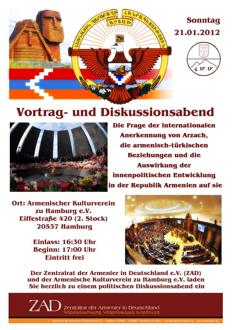 Der Zentralrat der Armenier in Deutschland e.V. organisiert in diesem Jahr eine Reihe von Vortrags- und Diskussionsabende. Unterschiedliche armenische Themen werden im regelmäßigen Rhythmus von aktiven, erfahrenen Gemeindemitgliedern und Akademikern aus Deutschland zur Diskussion gestellt.